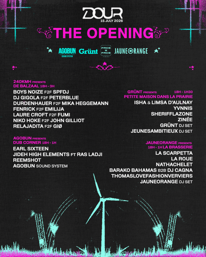 Fidèle à l’ADN multigenre qui caractérise l’événement depuis sa création en 1989, cette première journée mettra en avant les cultures musicales qui structurent historiquement l’identité du festival — musiques électroniques, hip-hop, rock et cultures bass — une diversité stylistique qui a contribué à faire de Dour l’un des rendez-vous majeurs des musiques actuelles en Europe. Pour incarner ces univers, l’organisation confie la programmation à quatre acteurs directement issus de ces scènes : le collectif électronique 240KMH, le média rap Grünt, le collectif rock liégeois JauneOrange et le sound system reggae dub Agobun Sound System.